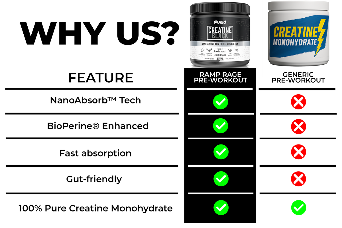 A2G Creatine Black is a high-performance supplement designed to boost your workouts, build muscle, and improve recovery. This advanced formula combines pure Creatine Monohydrate, BioPerine®, and our exclusive NanoAbsorb™ technology to ensure faster absorption and better results.